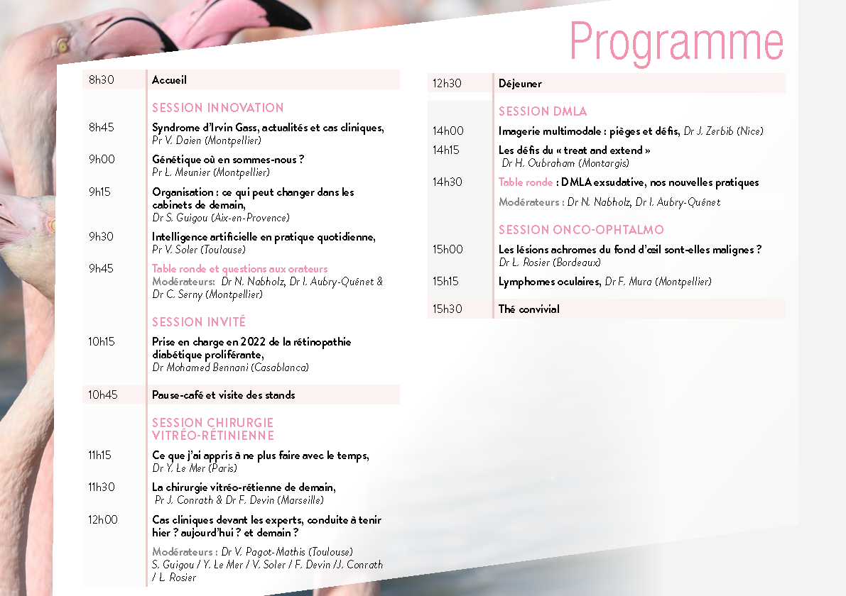 Chaque année, assistez à des ateliers et interagissez avec les meilleurs spécialistes de la rétine sur les dernières actualités en médecine et chirurgie, et renforcez votre équipe en l’invitant à la session Orthoptistes.