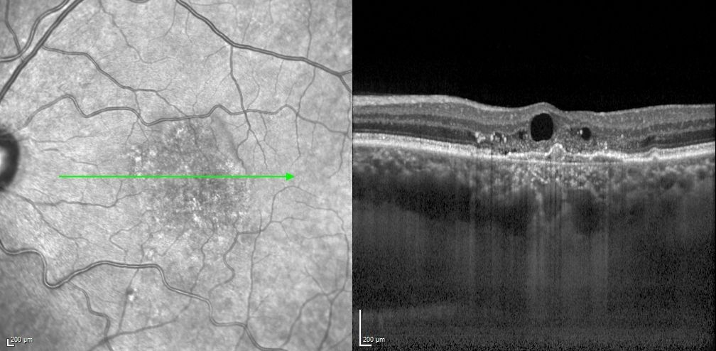 Mise en évidence d’une coulée gravitationnelle typique, traduisant l’évolution chronique de la maladie et les altérations de l’épithélium pigmentaire.